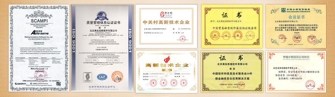 同時奧拓思維更獲得了行業(yè)的認可,先后獲得多項榮譽資質(zhì):CMMI 3 證書、ISO9001質(zhì)量體系認證證書、中關村高新技術企業(yè)、北京高新技術企業(yè)證書、中國貿(mào)易融資軟件供應服務商、中國軟件和信息化技術服務業(yè)10余年金融信息化優(yōu)秀解決方案、中國小額信貸聯(lián)盟會員證書、中國小額貸款公司協(xié)會會員。